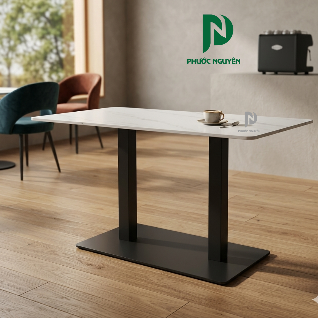 Hệ chân sắt sơn tĩnh điện được thiết kế theo cấu trúc khung chịu lực bền bỉ, giúp bàn luôn đứng vững vàng trên mọi mặt phẳng mà không có hiện tượng rung lắc. Lớp sơn mịn màng, đồng nhất không chỉ giúp bảo vệ phần lõi sắt khỏi tình trạng gỉ sét trong môi trường có độ ẩm cao như phòng pantry mà còn tạo nên một tổng thể hài hòa về màu sắc. Đây không chỉ là một chiếc bàn cafe bền bỉ mà còn là món đồ nội thất góp phần định hình phong cách chuyên nghiệp và hiện đại cho doanh nghiệp.