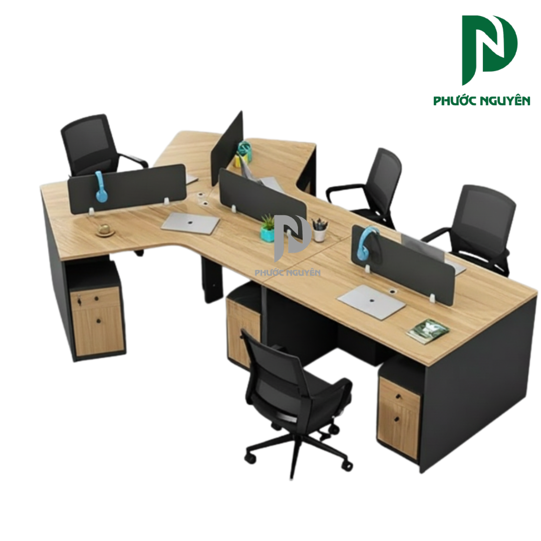 Sản phẩm sở hữu vẻ đẹp thanh thoát nhờ sự kết hợp giữa khung chân sắt sơn tĩnh điện vững chãi và mặt bàn vân gỗ sáng màu. Thiết kế này không chỉ giúp không gian trở nên thông thoáng, hiện đại mà còn khơi gợi tinh thần đồng đội, tạo môi trường làm việc cởi mở nhưng vẫn đảm bảo sự riêng tư cần thiết để mỗi cá nhân tập trung hoàn thành mục tiêu chung.