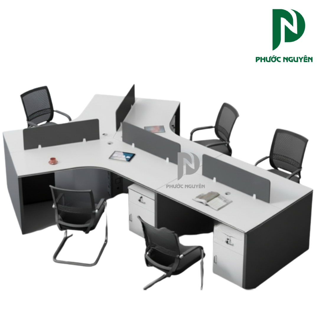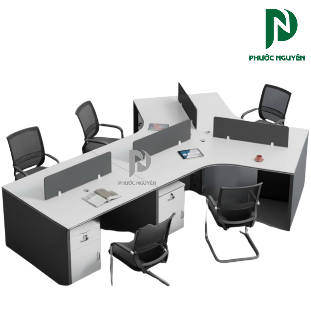 Để cân bằng giữa tính cộng tác và sự tập trung, cụm bàn 001 tích hợp hệ thống vách ngăn lửng tinh gọn. Chi tiết này giúp phân định ranh giới làm việc cá nhân một cách rõ ràng, giảm thiểu tiếng ồn và sự xao nhãng từ xung quanh. Nhờ đó, mỗi nhân viên đều có được một "khoảng trời riêng" để xử lý công việc chuyên sâu mà vẫn có thể trao đổi ngay lập tức với đồng nghiệp bên cạnh khi cần thiết.