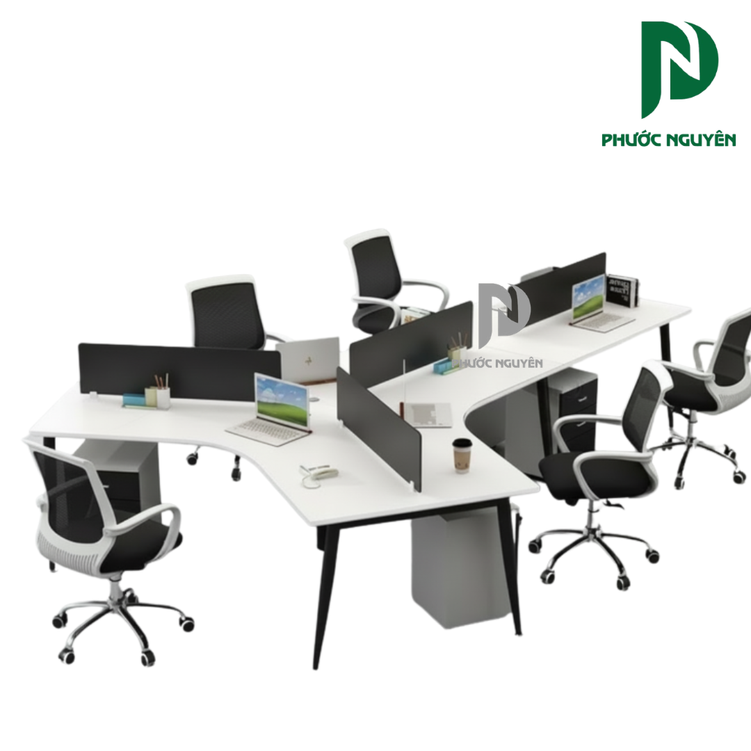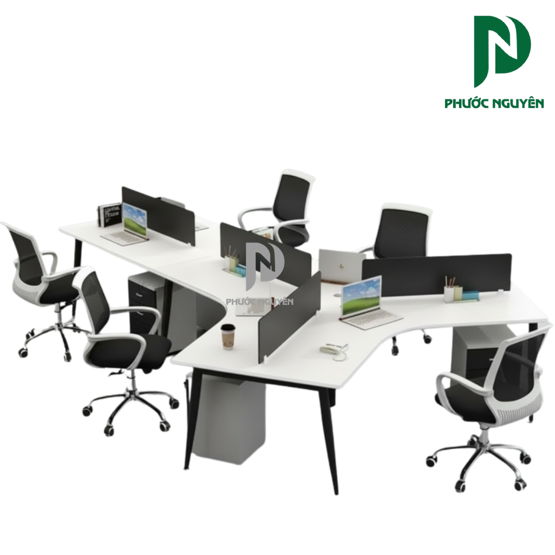 Để đảm bảo hiệu suất công việc cao nhất, bàn cụm 004 tích hợp hệ thống vách ngăn lửng thiết kế mỏng nhẹ. Chi tiết này đóng vai trò then chốt trong việc phân tách không gian cá nhân tinh tế, giúp nhân viên tránh được các tác nhân gây xao nhãng nhưng không làm mất đi khả năng tương tác nhóm. Mọi thành viên vẫn có thể trao đổi nhanh ngay tại chỗ, hỗ trợ đắc lực cho tinh thần làm việc cộng tác hiệu quả.