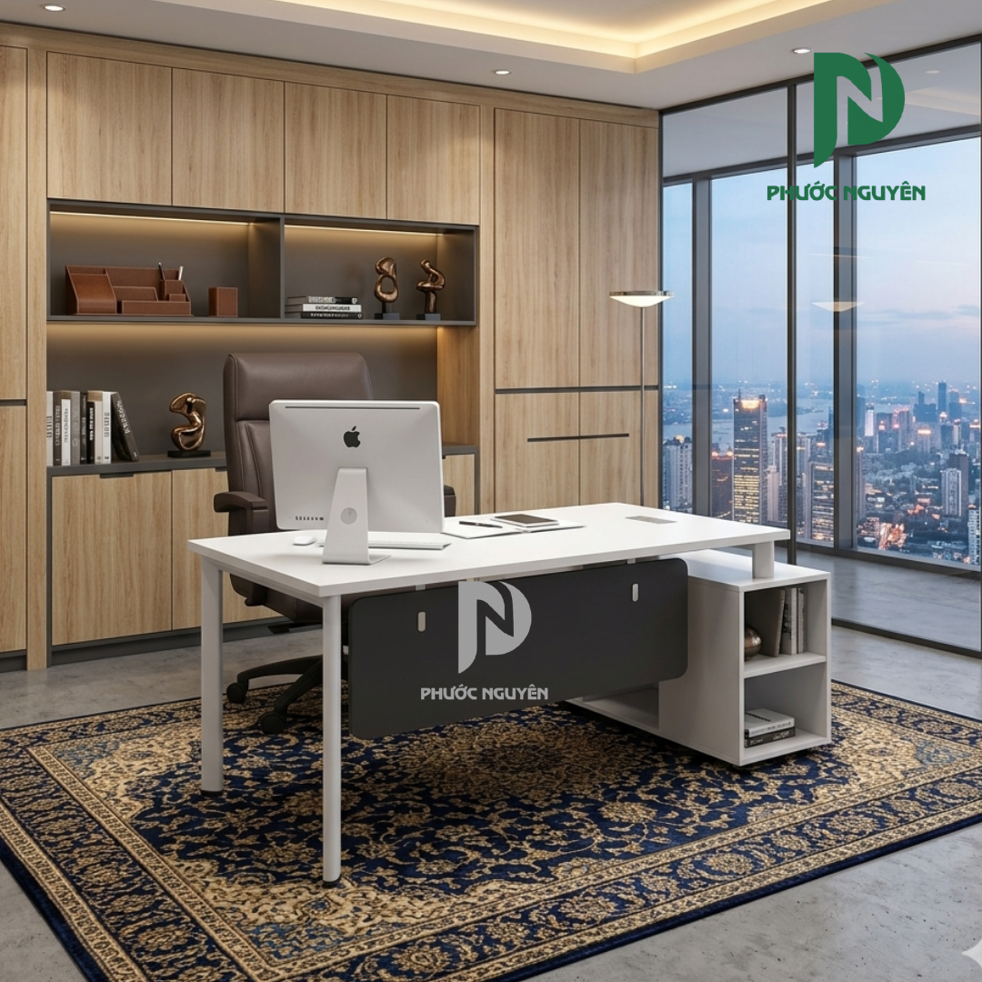 Sản phẩm nổi bật với thiết kế "góc làm việc 90 độ" thông minh, giúp người lãnh đạo tận dụng triệt để diện tích tại các góc phòng, biến những khoảng trống đơn điệu thành một trạm điều hành đa năng. Cấu trúc chữ L cho phép phân tách rạch ròi các khu vực chức năng: một nhánh dành cho tiếp khách và ký kết văn bản, nhánh còn lại tập trung cho các thiết bị công nghệ và lưu trữ hồ sơ, giúp duy trì sự ngăn nắp và khoa học tuyệt đối trong quá trình vận hành doanh nghiệp.