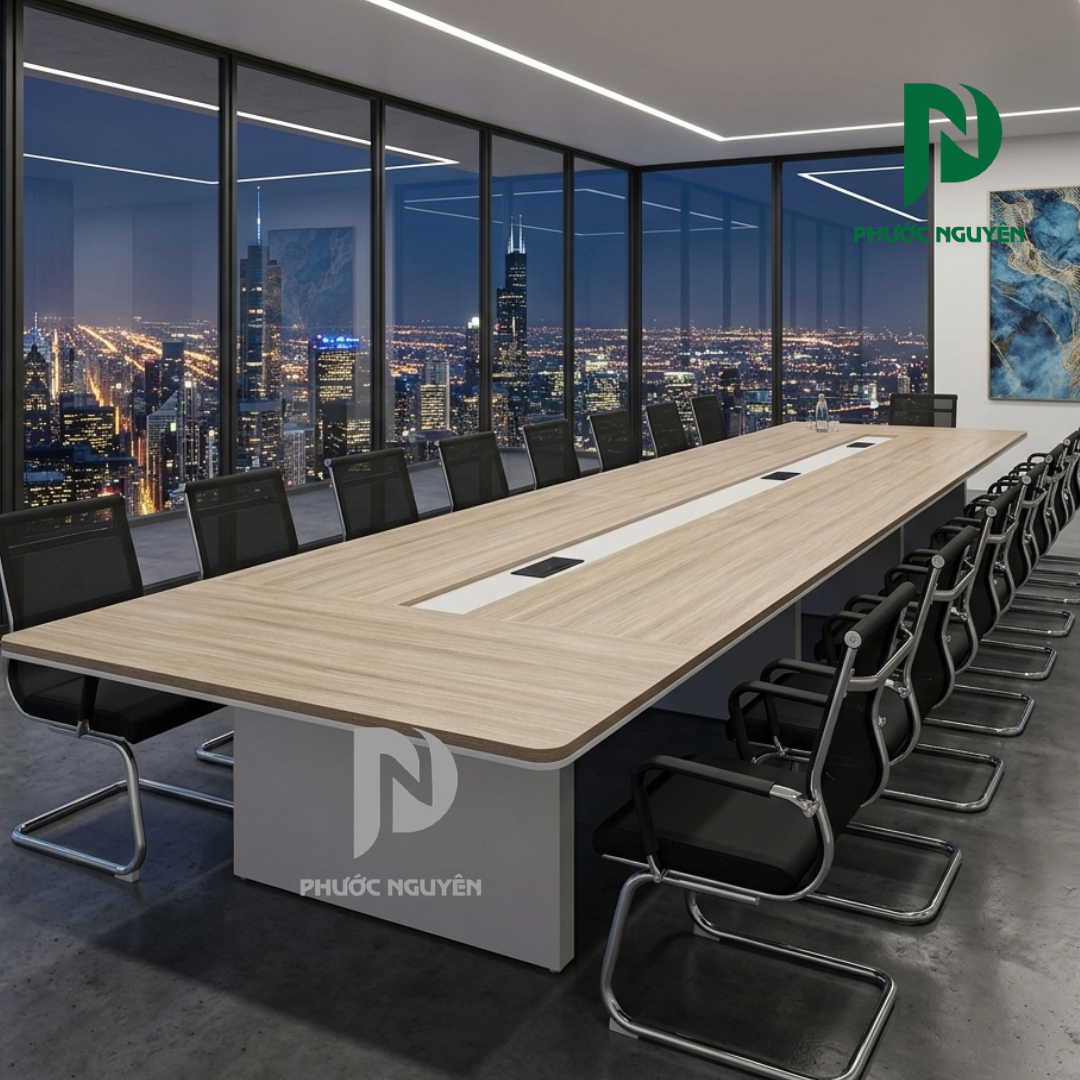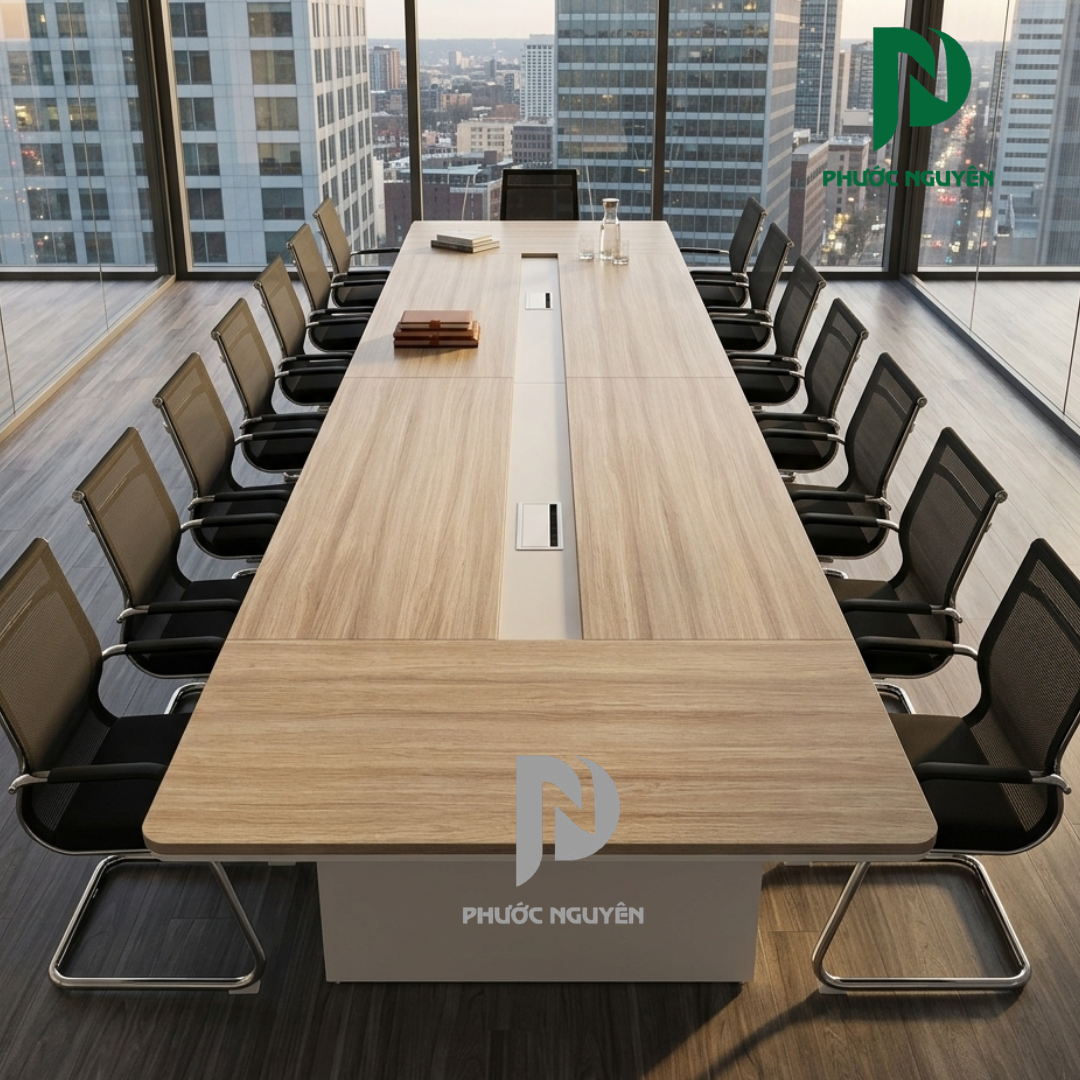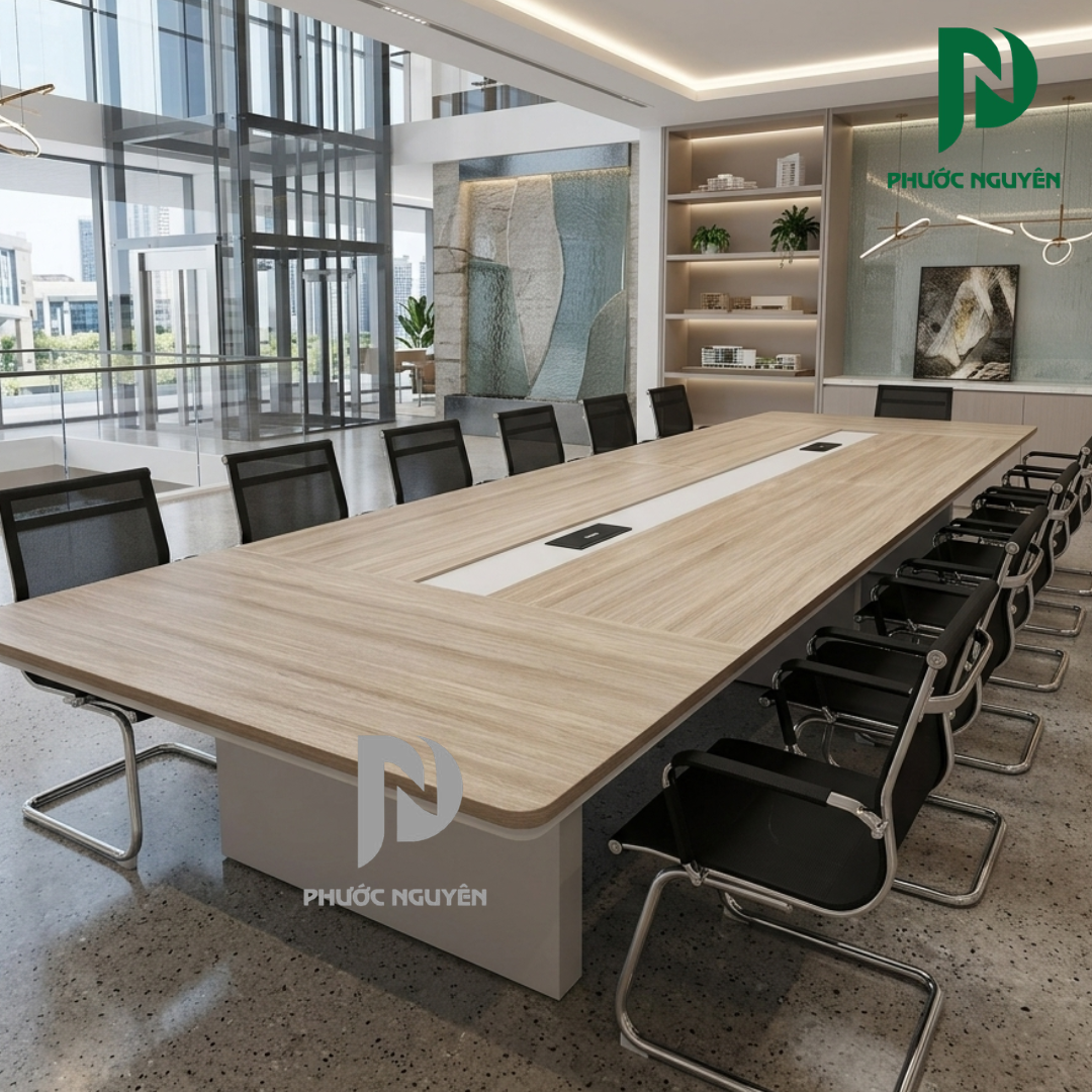 Bàn được thiết kế với không gian sử dụng rộng rãi, giúp nhiều người có thể ngồi họp thoải mái mà vẫn đảm bảo khoảng cách hợp lý. Điều này hỗ trợ tốt cho các buổi họp nhóm, trao đổi công việc hoặc tiếp khách.