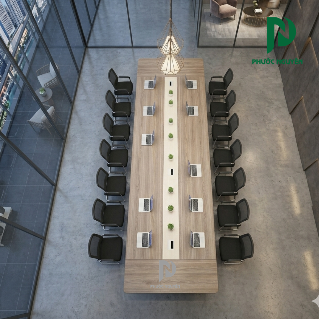Thiết kế bàn dài với sức chứa nhiều vị trí ngồi giúp tối ưu không gian họp, phù hợp cho các buổi họp nhóm, họp nội bộ hoặc tiếp khách. Khoảng cách giữa các vị trí được bố trí hợp lý, tạo sự thoải mái khi sử dụng.
