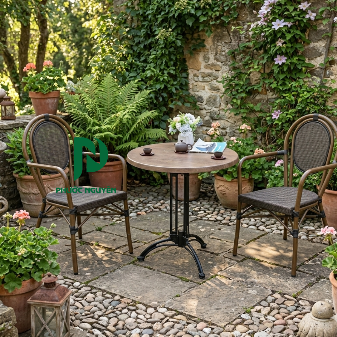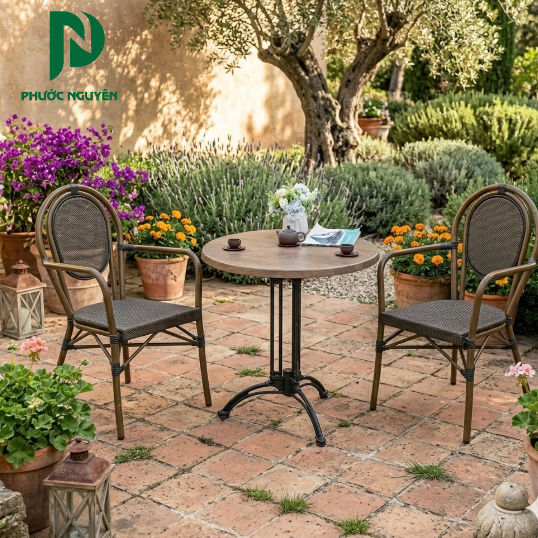*Mặt bàn polywood, dễ vệ sinh, phù hợp không gian ngoài trời