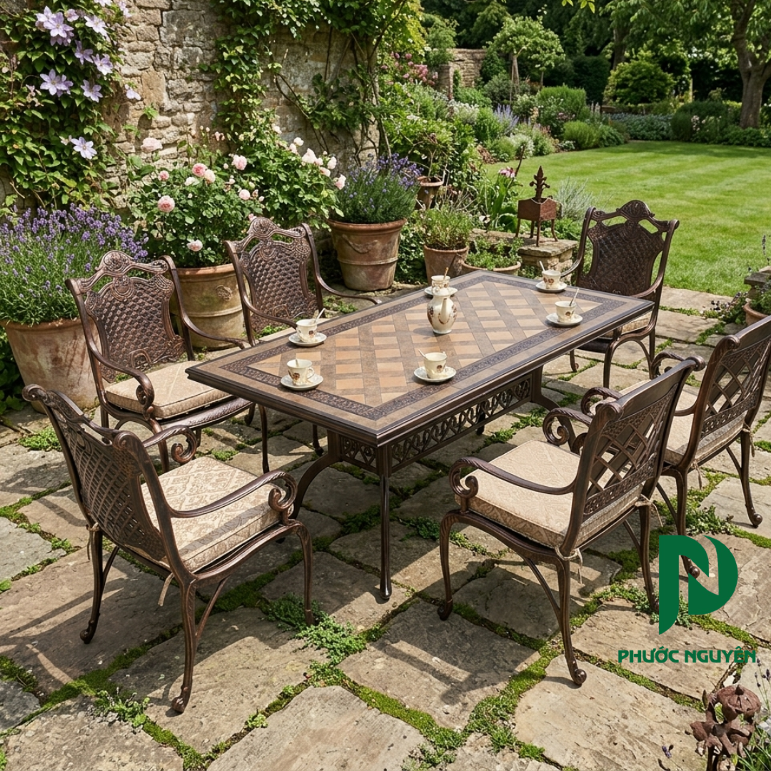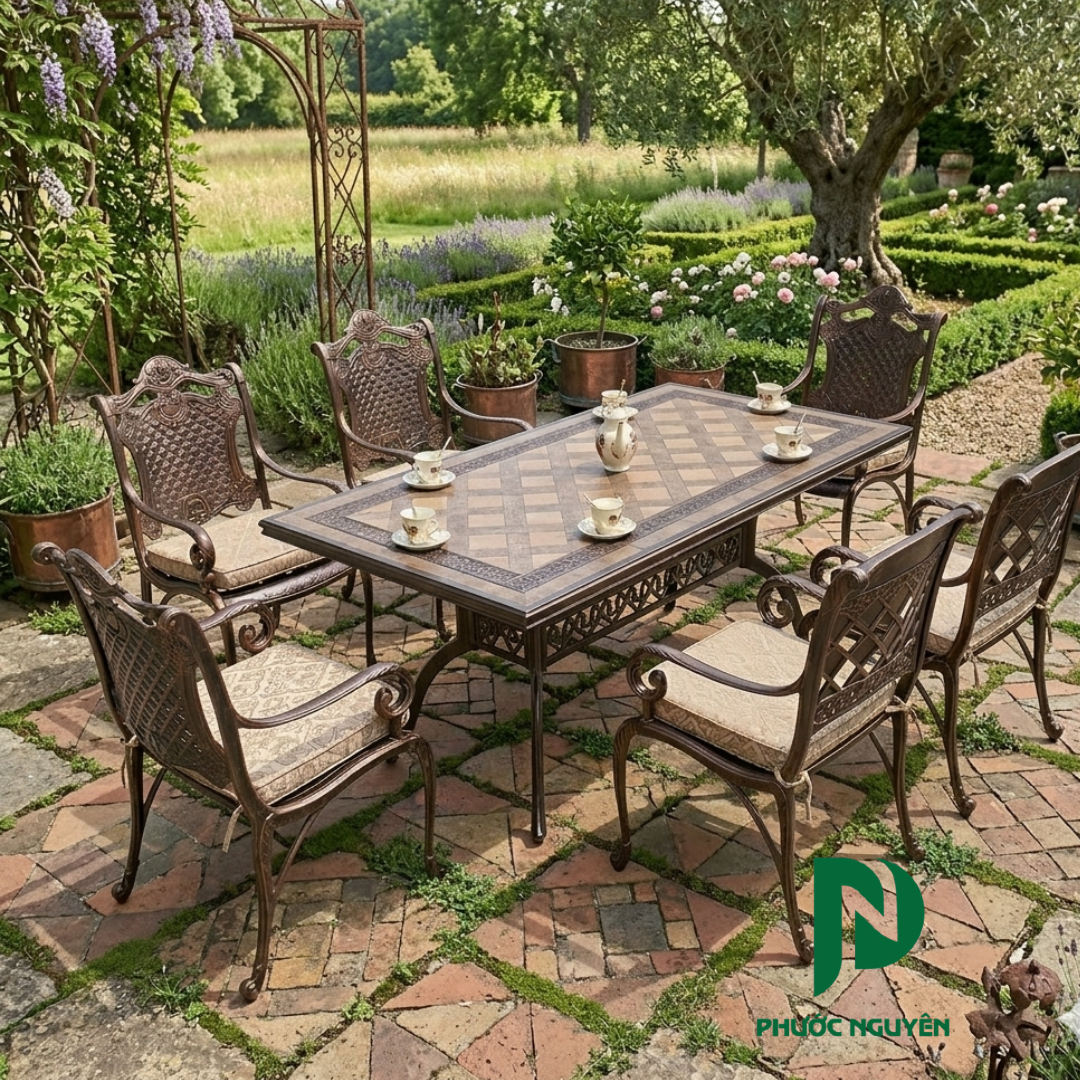 Nếu các mẫu trước đó dành cho những góc nhỏ riêng tư, thì Bộ Bàn Ghế Sân Vườn - 003 lại là một "đại tiệc" của sự sang trọng và quyền uy dành cho không gian ngoại thất quy mô lớn. Được chế tác từ nhôm đúc nguyên khối – đỉnh cao của vật liệu ngoài trời, sản phẩm mang đến vẻ đẹp vĩnh cửu, thách thức mọi giới hạn của thời gian và thời tiết. Với chiều dài bàn lên đến 188cm, bộ sản phẩm không chỉ là món đồ nội thất mà còn là trung tâm kết nối, nơi diễn ra những buổi tiệc BBQ thân mật, những cuộc họp chiến lược ngoài trời hay những giờ nghỉ ngơi trà chiều đẳng cấp của giới thượng lưu.