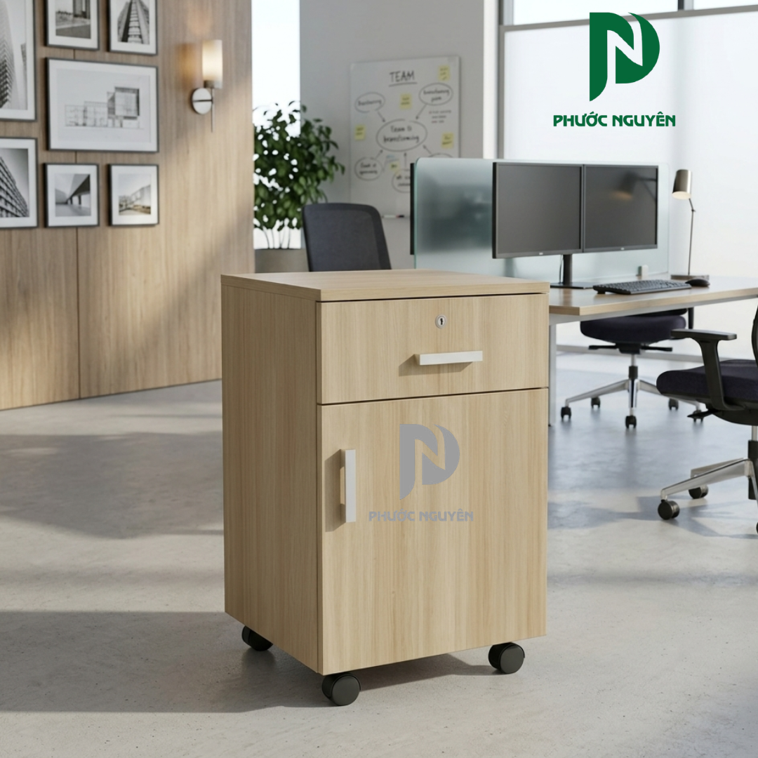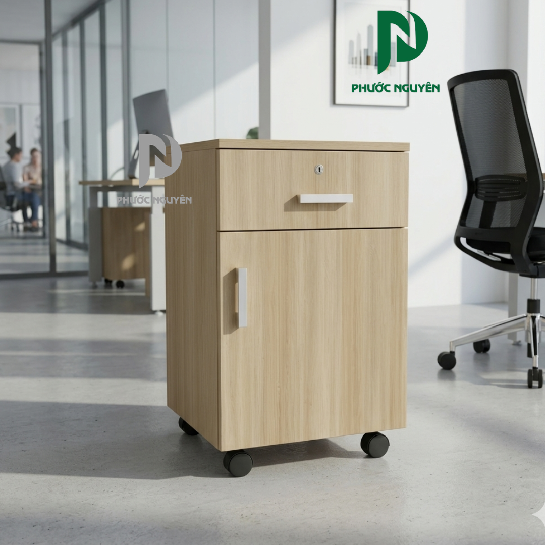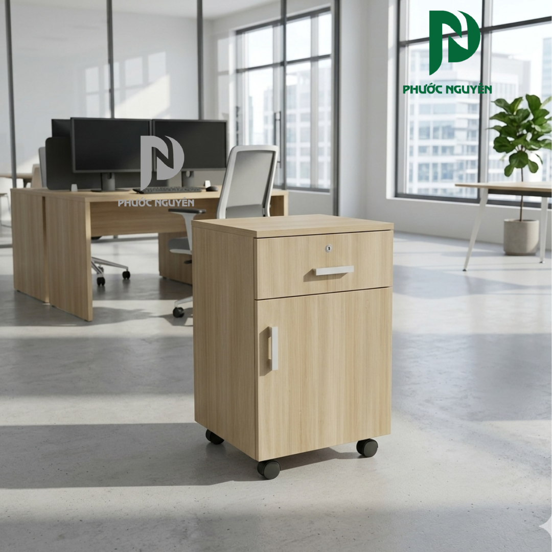 Được chế tác từ gỗ công nghiệp phủ Melamine cao cấp, hộc tủ sở hữu bề mặt láng mịn cùng những đường nét vuông vắn, hiện đại. Đây không chỉ là một giải pháp lưu trữ di động thông minh mà còn đóng vai trò như một mảnh ghép thẩm mỹ, giúp đồng bộ hóa phong cách thiết kế của hệ thống bàn làm việc, từ đó tạo ra môi trường làm việc chỉn chu, khơi gợi cảm hứng sáng tạo và sự tập trung cao độ.