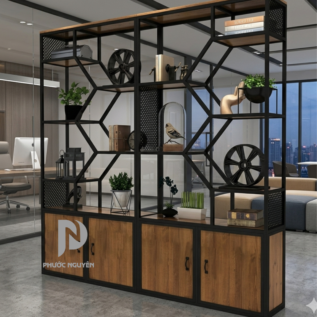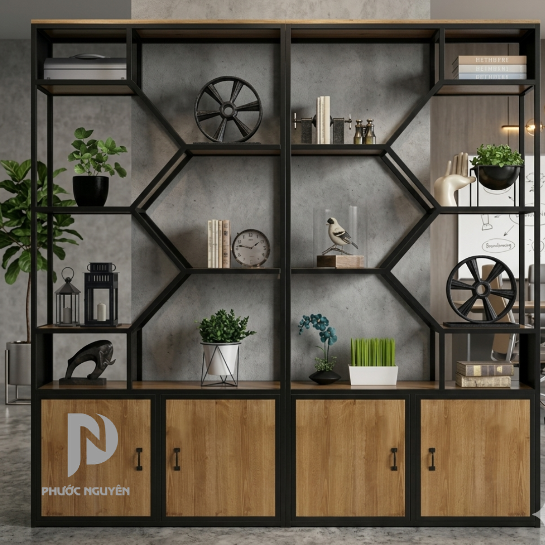 Sản phẩm sử dụng cốt gỗ MDF chống ẩm đạt chuẩn kết hợp cùng hệ khung sắt sơn tĩnh điện bền bỉ, mang lại vẻ đẹp vững chãi nhưng vô cùng thanh thoát. Đây không chỉ là nơi lưu trữ tài liệu khoa học mà còn đóng vai trò là một vách ngăn không gian thông minh, giúp phân tách các khu vực chức năng một cách khéo léo, đồng thời nâng tầm hình ảnh chuyên nghiệp và chỉn chu cho toàn bộ văn phòng.