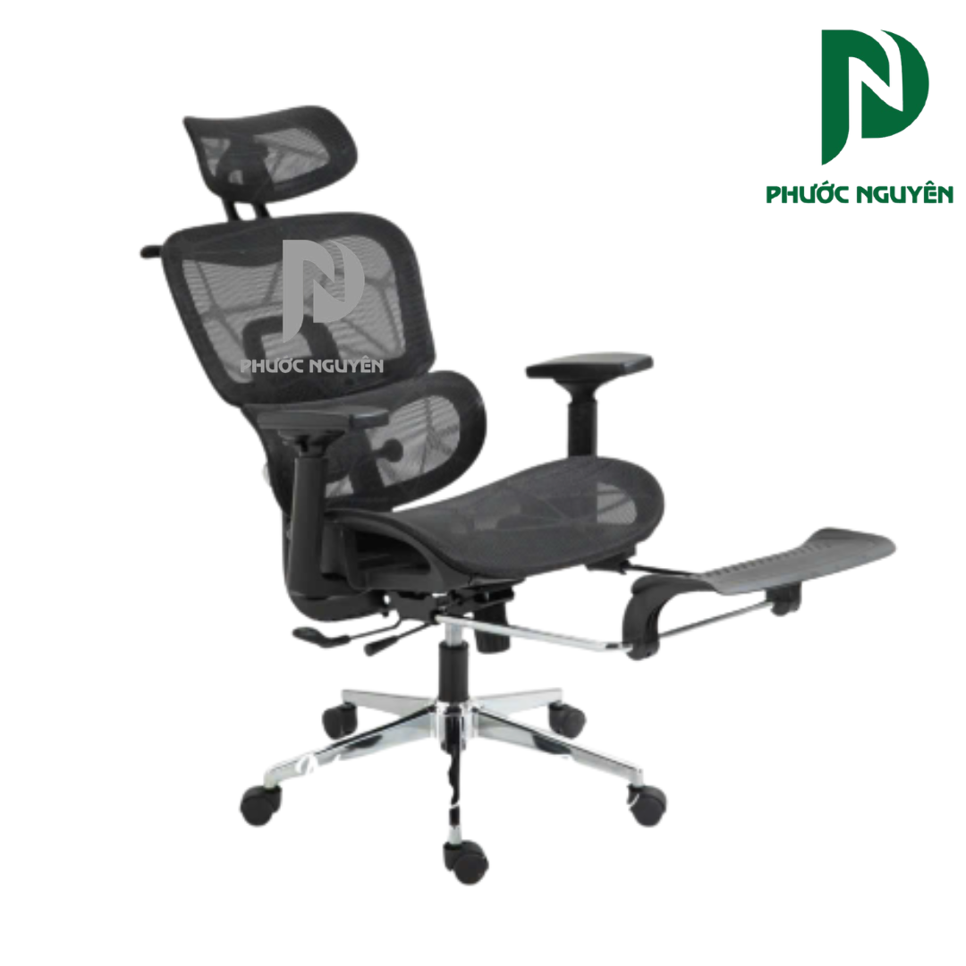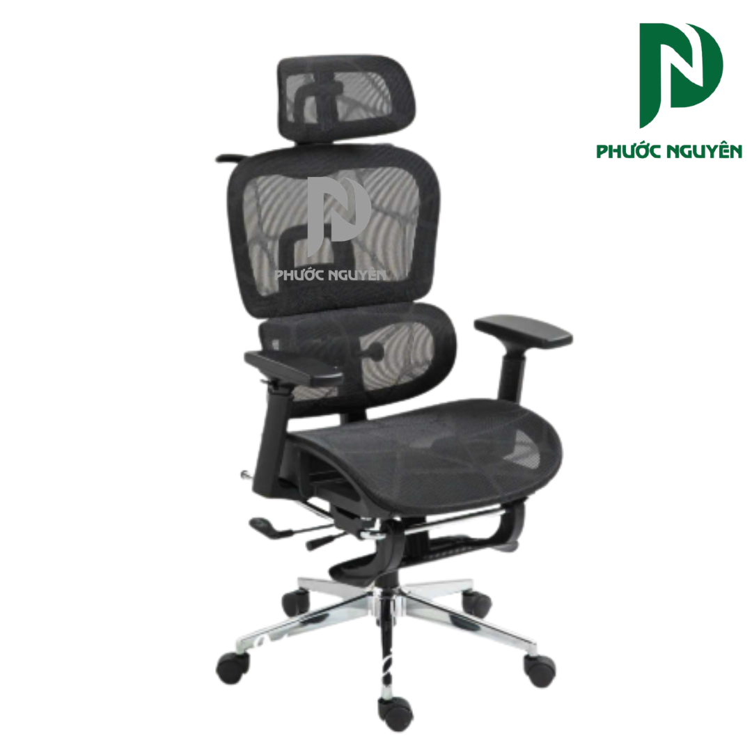 Phần lưng và đệm sử dụng lưới cao cấp kết hợp khung kim loại chắc chắn, giúp tăng độ bền và khả năng thoáng khí khi sử dụng lâu. Tay vịn bọc da kết hợp crom tạo điểm nhấn sang trọng và mang lại cảm giác thoải mái.